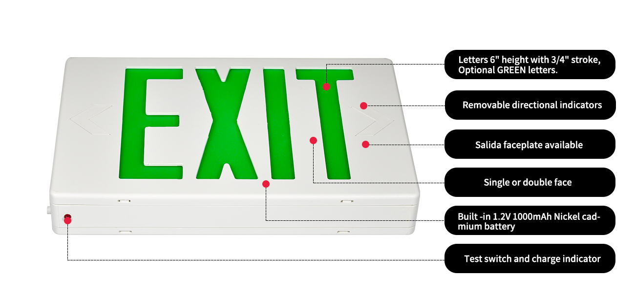 *Belysning - LED Exit Sign Series Illumination oppnås ved å bruke langvarig, effektive ultra -lysegrønne lysdioder. Fargematchet diffusor eliminerer hots flekker og striper, og gir optimal lysutgang.