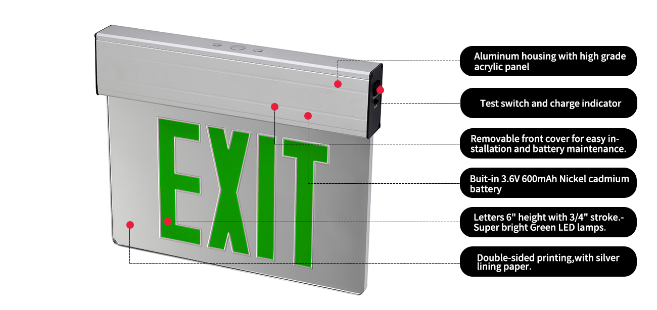 Det ultimate avkjørselen i design og allsidighet. Dette grønne LED -kant -lysutgangsskiltet vil løse nesten ethvert monteringskonfigurasjonsproblem.  Denne ene stilen gir mulighet for tak-, side- og veggmonteringsinstallasjon.  Det kantlette panelet er konstruert av høykvalitets akryl med tilpassbare retningspiler for å peke mot avkjøringsretning. Mirror Divider Single og på dobbelt ansiktsversjoner. Det avtakbare frontdekselet gjør installasjon og vedlikeholdshodepinefritt!