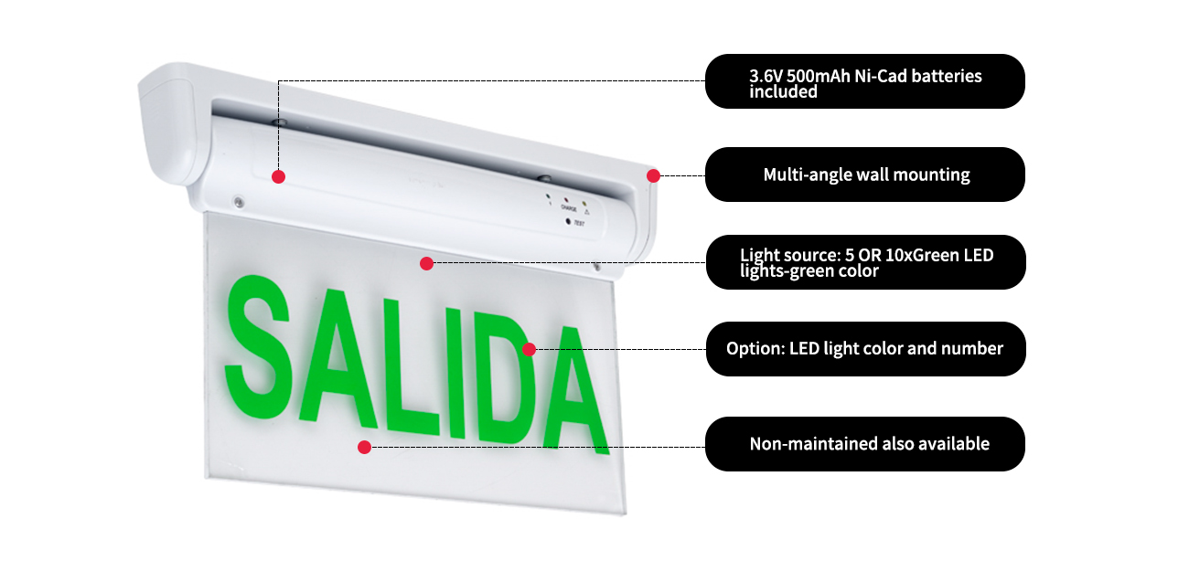 *Belysning - LED Exit Sign Series Illumination oppnås ved å bruke langvarig, effektive ultra -lysegrønne lysdioder. Fargematchet diffusor eliminerer hots flekker og striper, og gir optimal lysutgang.