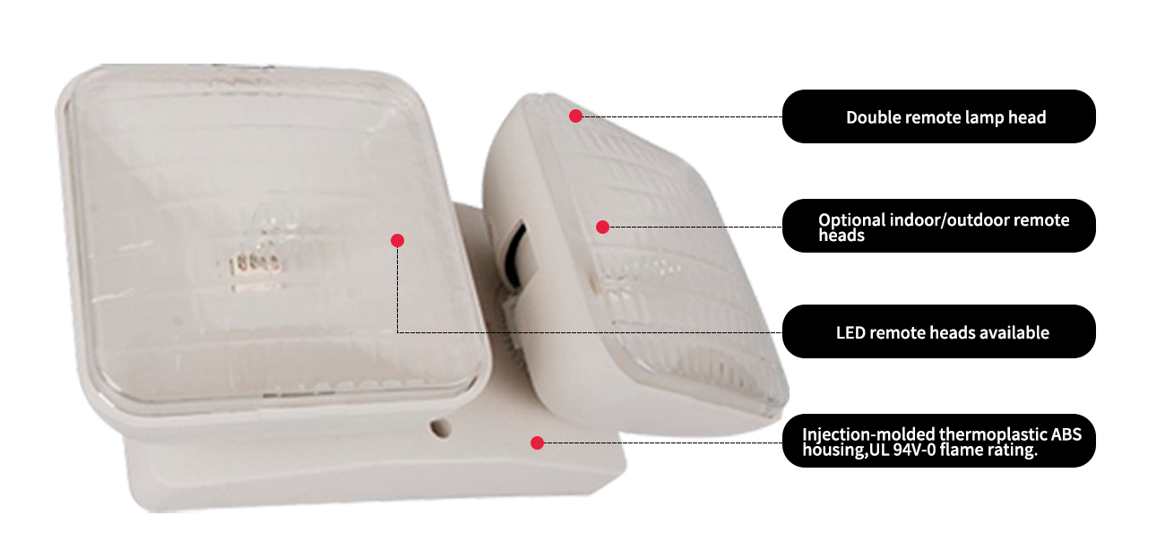 Hjem / Produkt / Nødlys / LED Emergency Light Remote Head / JRH-2-UL 94V-0 FLAME RATING DOBBEL FRATT LAMP-hoder